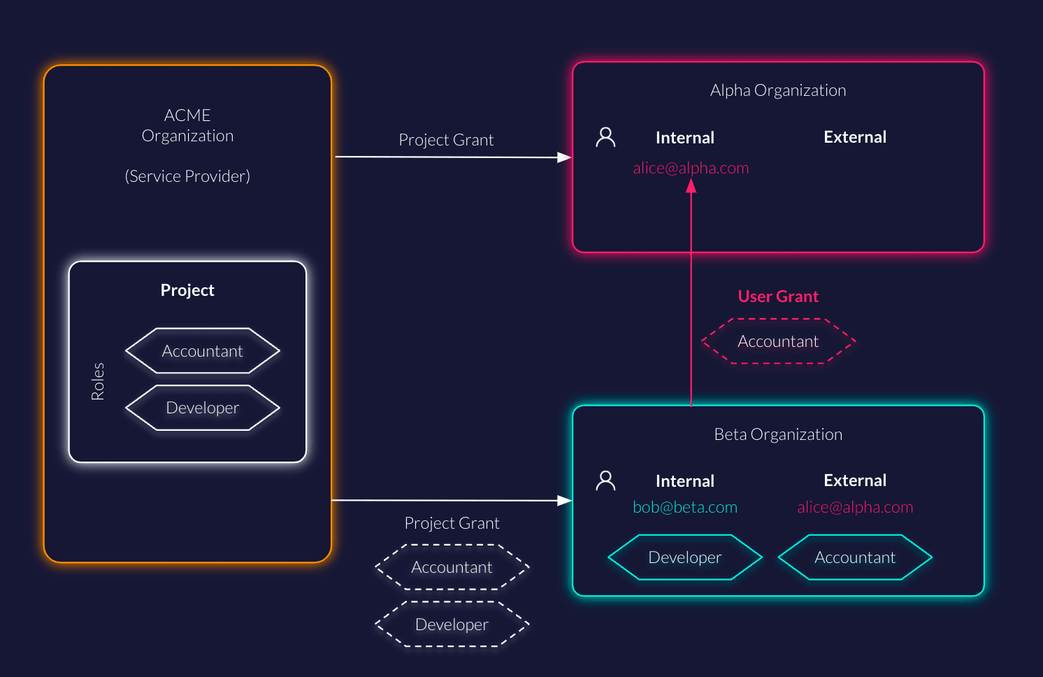 ZITADEL allows you to create separate organizations for each of your business partner or tenant. There might be cases were users from one organization need access to projects from another organization. You can create an external user grant, that allows the inviting organization to manage the roles for the external user.
