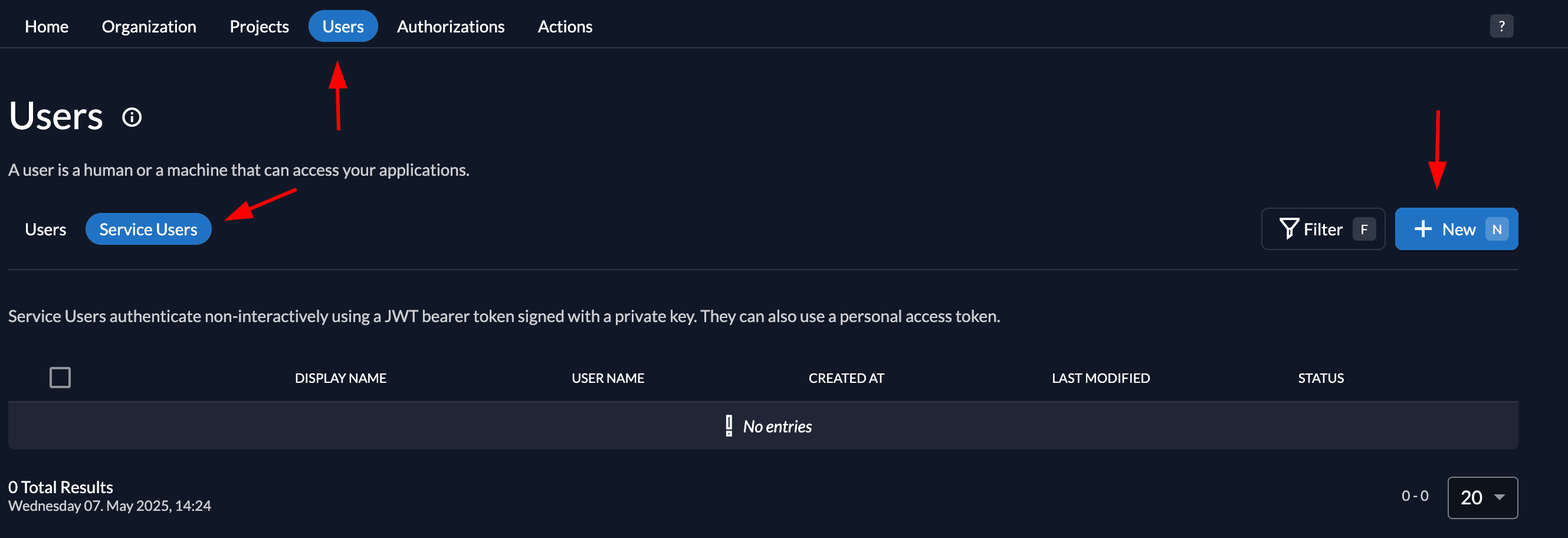 Give the service account a name and a username. Select Bearer as Access Token Type.