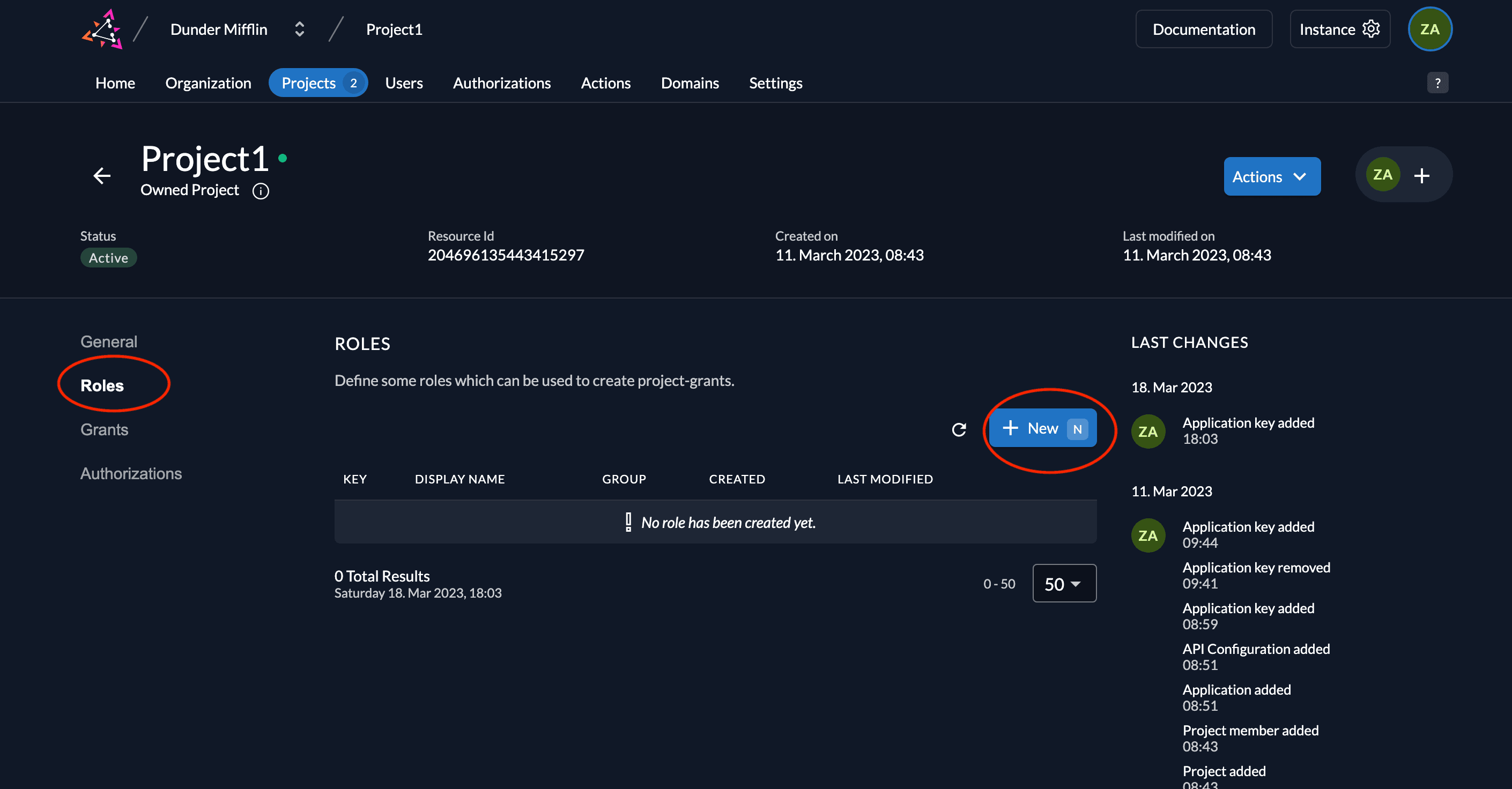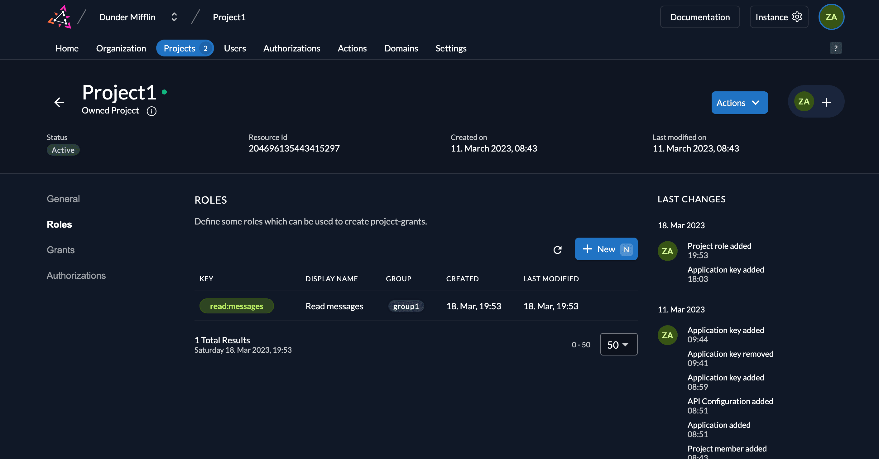 In order to access this route, you must create the role read:messages in your ZITADEL project and also create an authorization for the service account you created by adding the role to the user. Follow these steps to do so: