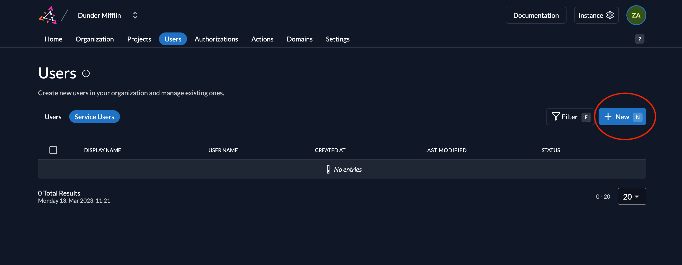 - Go to the Users tab in your organization as shown below and click on the Service Accounts tab.
