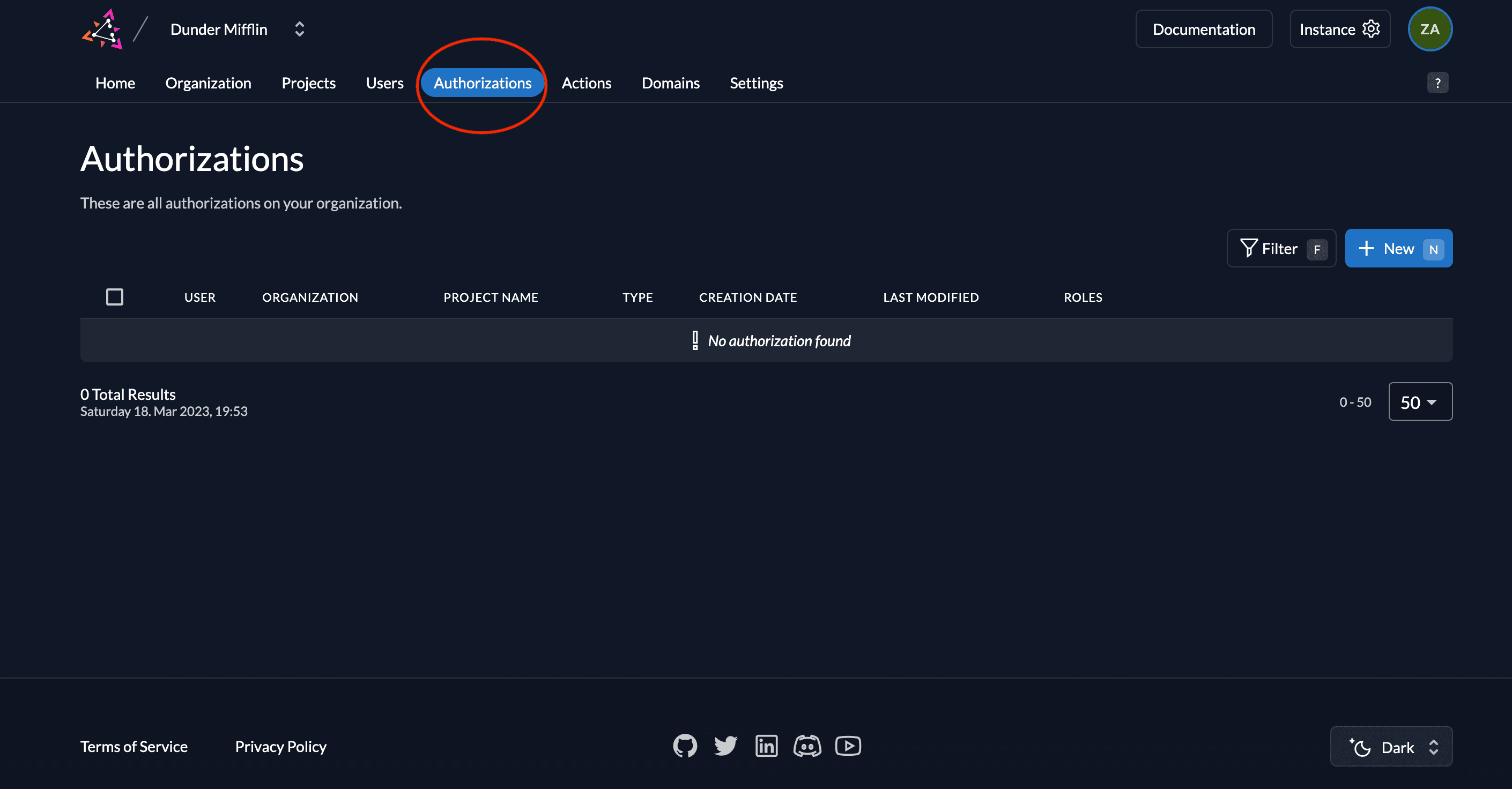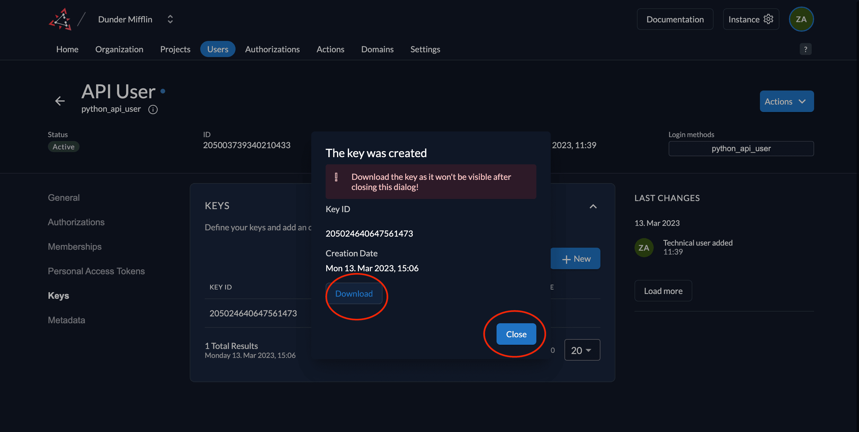 - Next, we need to generate a private-public key pair in ZITADEL and you must get the private key to sign your JWT. Go to Keys and click on New.