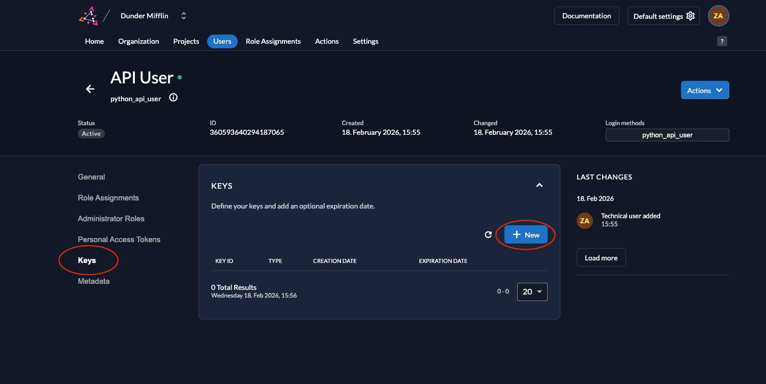 - Next, we need to generate a private-public key pair in ZITADEL and you must get the private key to sign your JWT. Go to Keys and click on New.