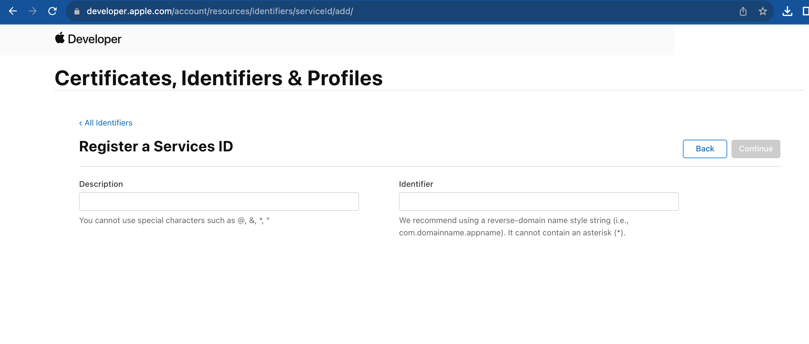 - Go to the Identifiers of your Apple Developer Account