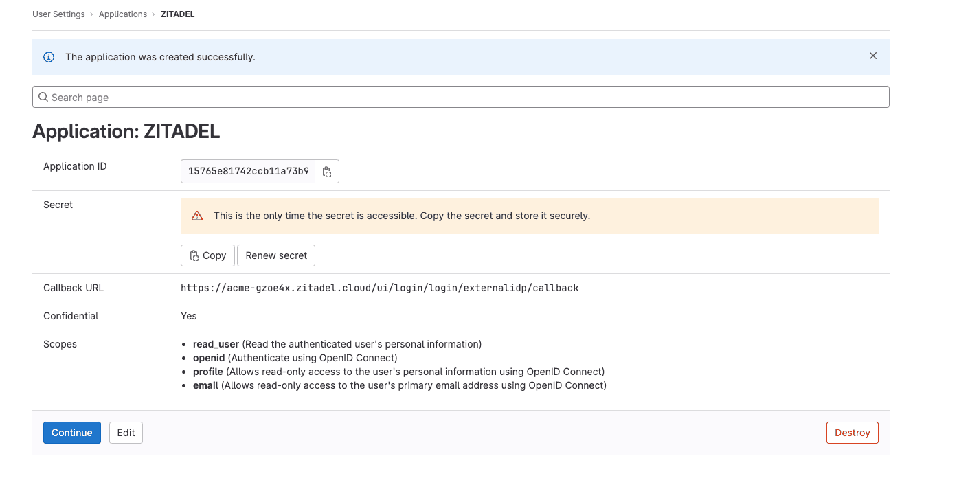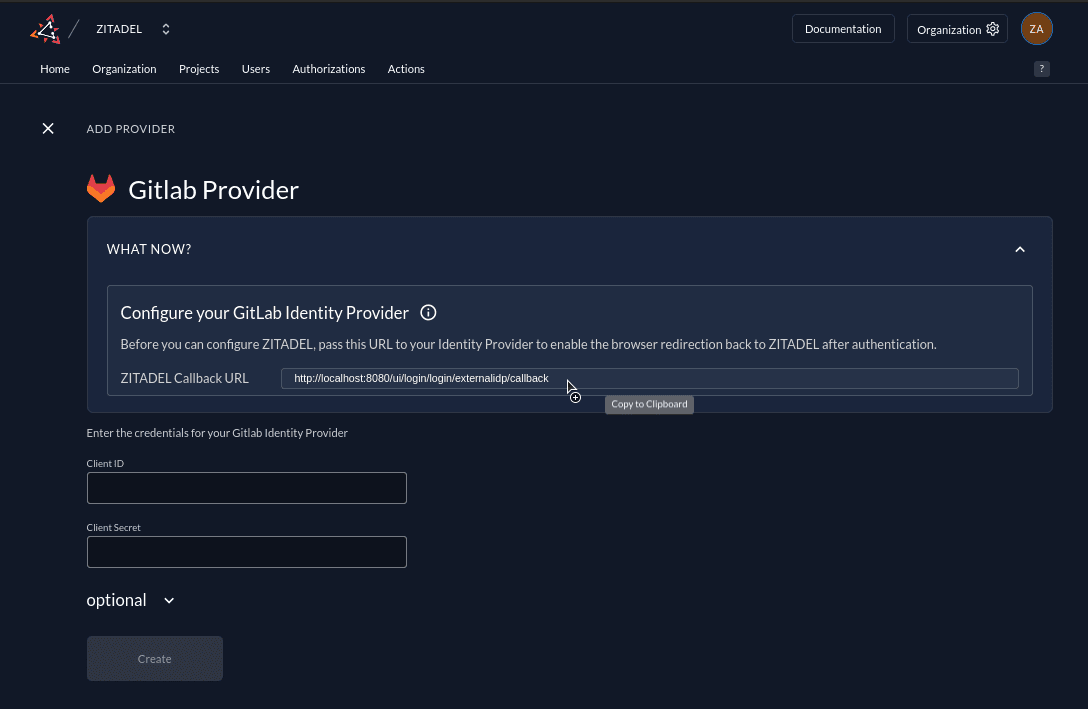 Click on the ZITADEL Callback URL to copy it to your clipboard. You will have to paste it to the GitLab Application later.