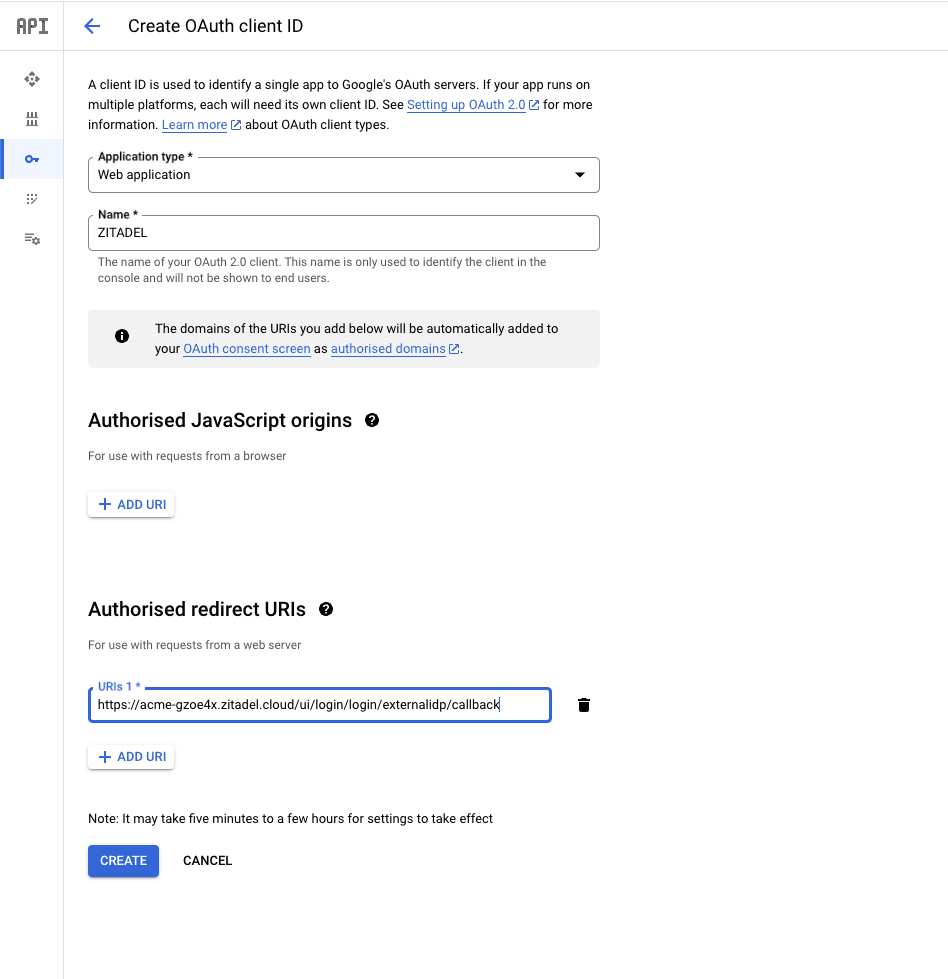 Click on the ZITADEL Callback URL to copy it to your clipboard. You will have to paste it in the Google Cloud Platform later.