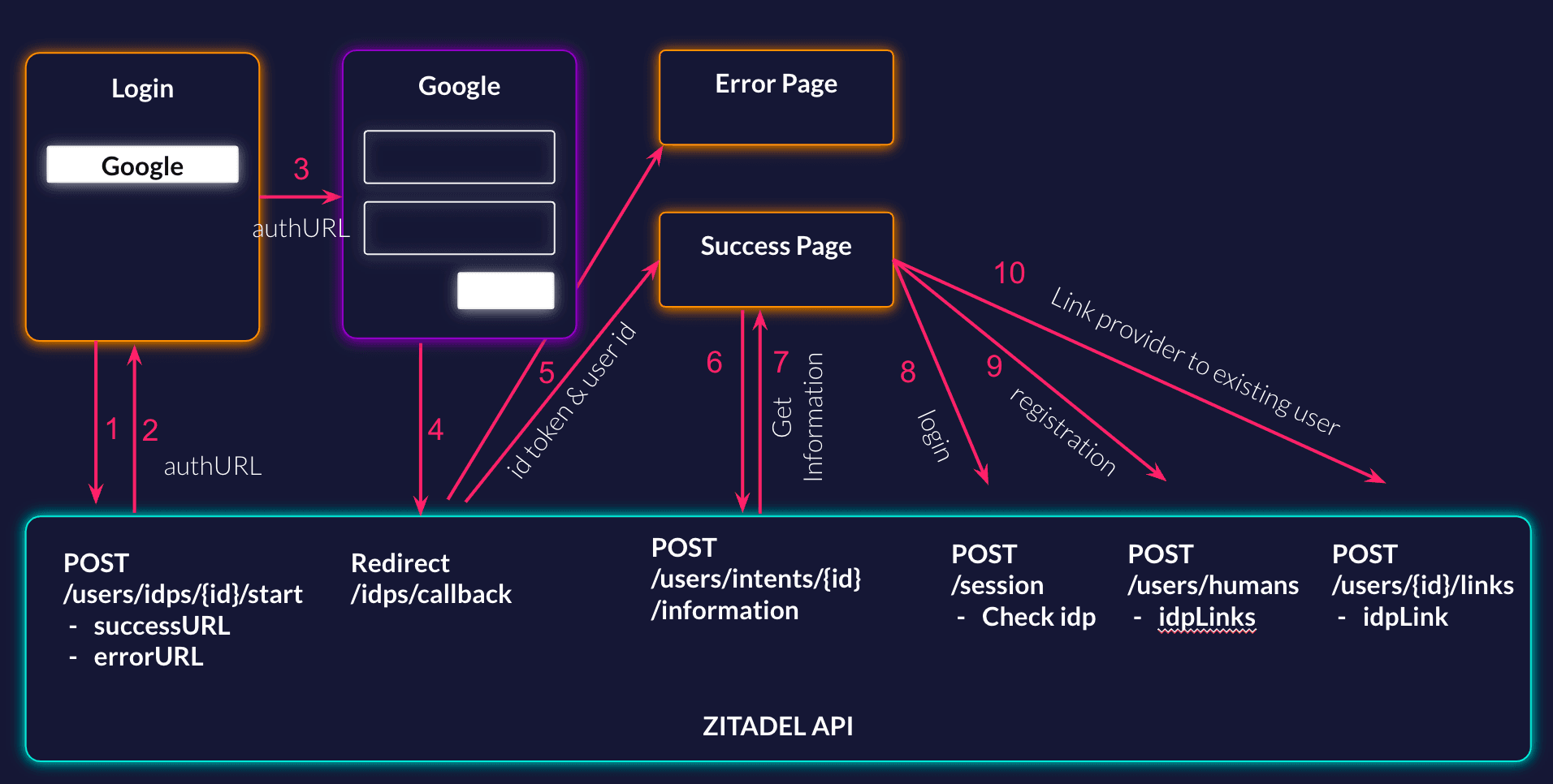 ZITADEL will take the information of the provider. After this, a redirect will be made to either the success page in case of a successful login or to the error page in case of a failure will be performed. In the parameters, you will provide the IDP intentID, a token, and optionally, if a user could be found, a user ID.