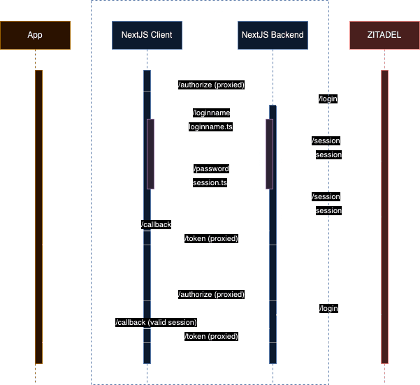 The communication from the browser to the server is done by NextJS Server Actions. The OIDC Auth request is always passed in the url to have a context to the ongoing authentication flow.