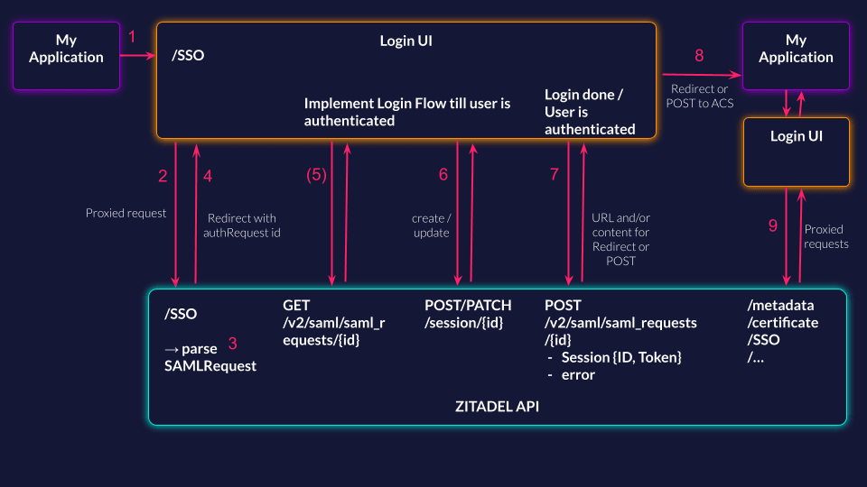 - All SAML-specific endpoints have to be accepted in the Login UI and should be proxied and sent to the ZITADEL API