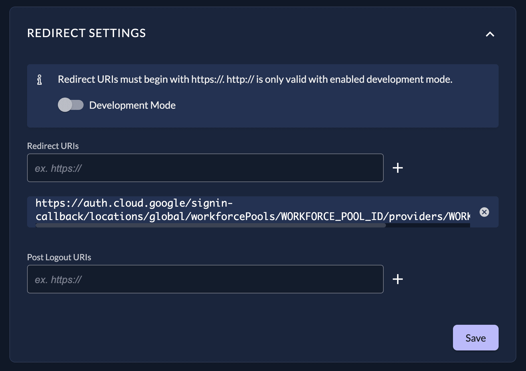 Make sure to replace the WORKFORCE_POOL_ID and WORKFORCE_PROVIDER_ID with your values in the redirect url