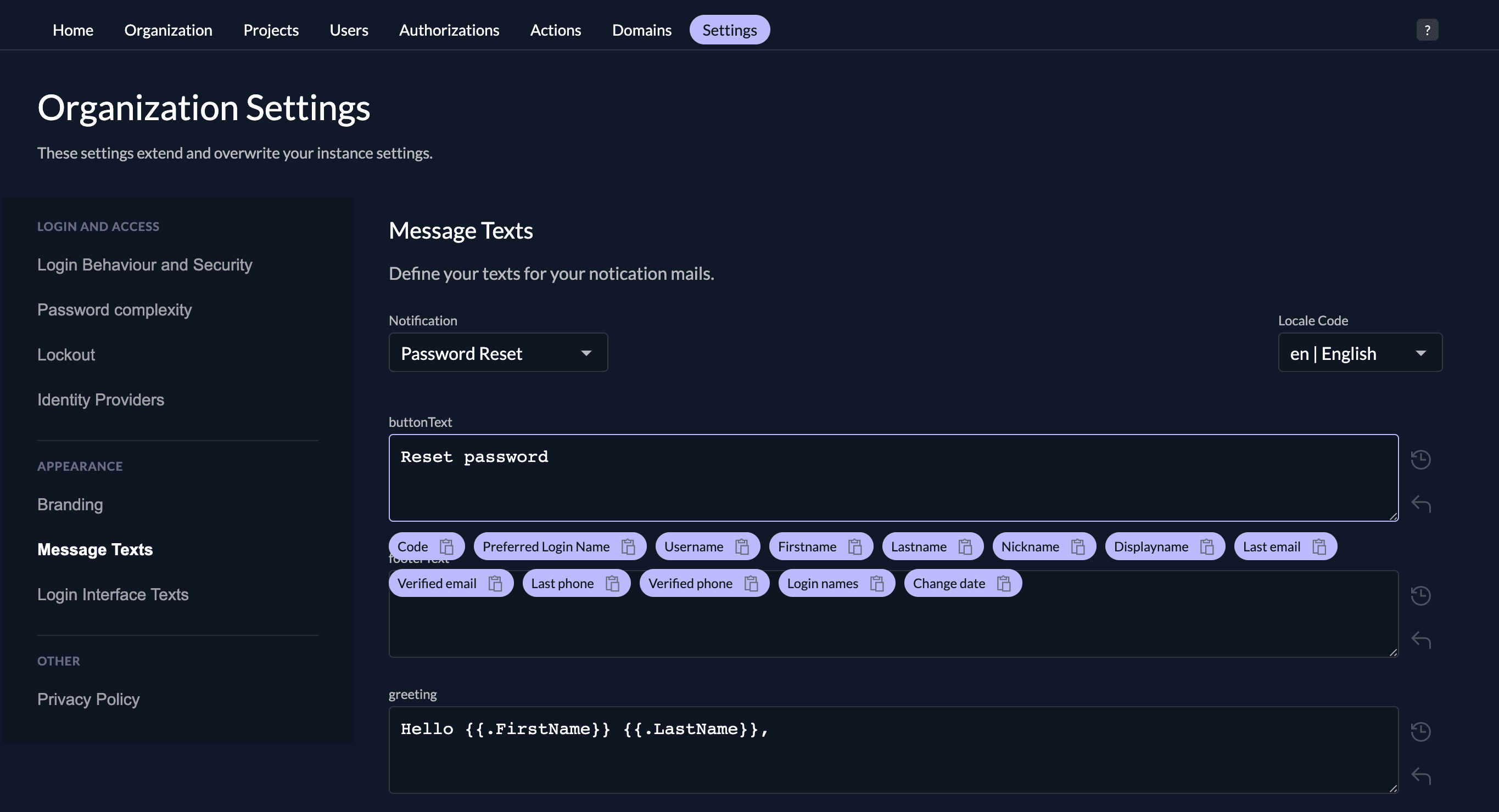 Go to the message text policy on your organization, and you will find the different kinds of messages that are sent from ZITADEL. Choose the template and the language you like to edit. You can now change all the texts from a message. As soon as you click into an input field you will see some attribute chips below the field. These are the parameters you can include on this specific message.