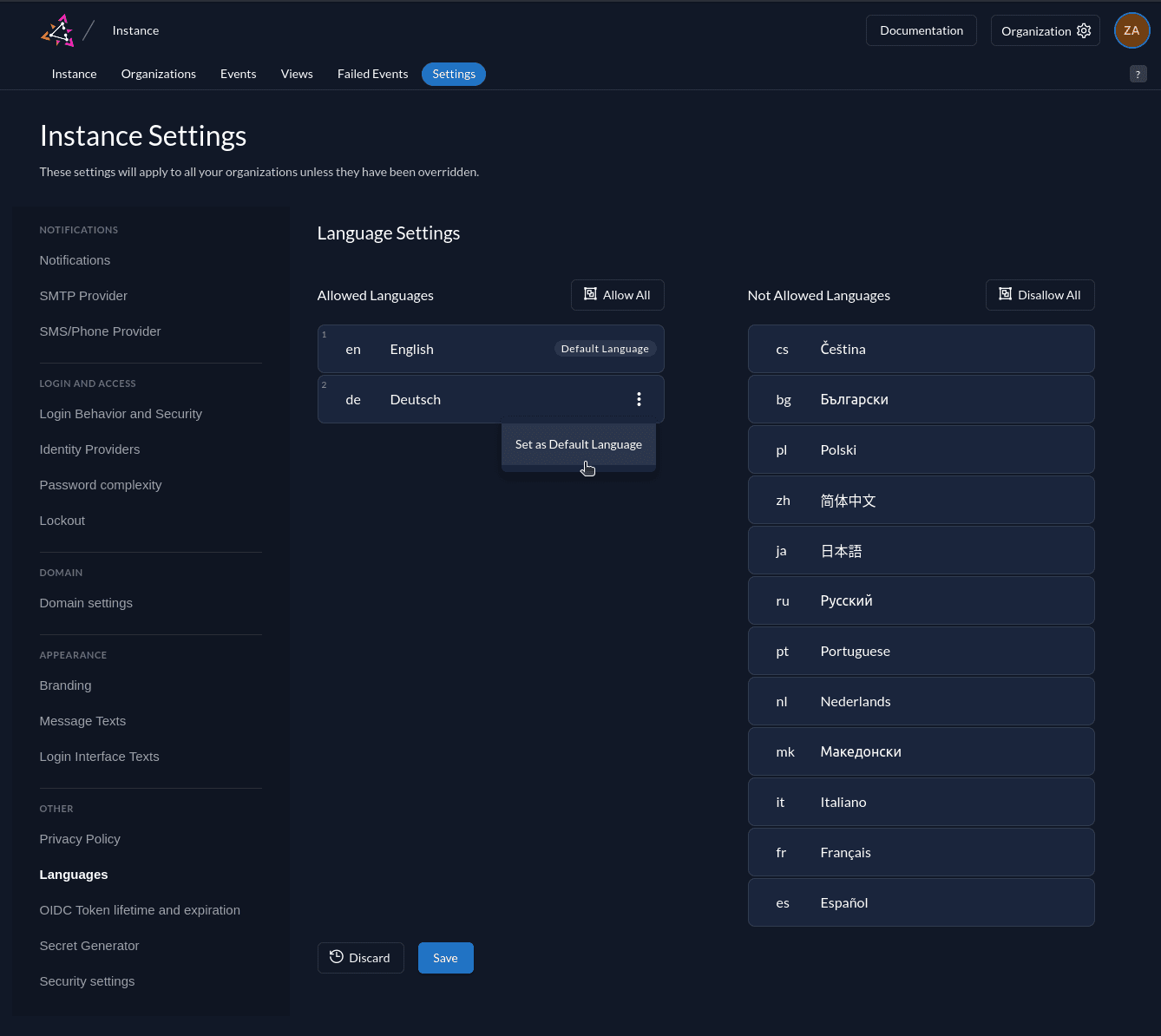 If you only want to enable a subset of the supported languages, you can configure the languages you'd like to allow using the restrictions API. The login UI and notification messages are only rendered in one of the allowed languages and fallback to the instances default language. Also, the instances OIDC discovery endpoint will only list the allowed languages in the ui_locales_supported field.