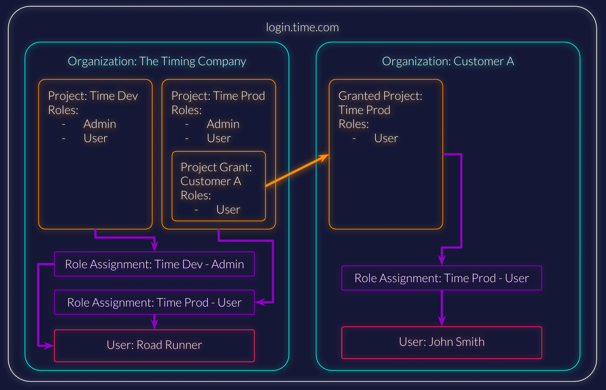 The Timing Company has a product called Time. They have two environments, the development and the production environment. In this case Time uses authentication and authorizations from ZITADEL. This means that the users and also their authorizations will be managed within ZITADEL.