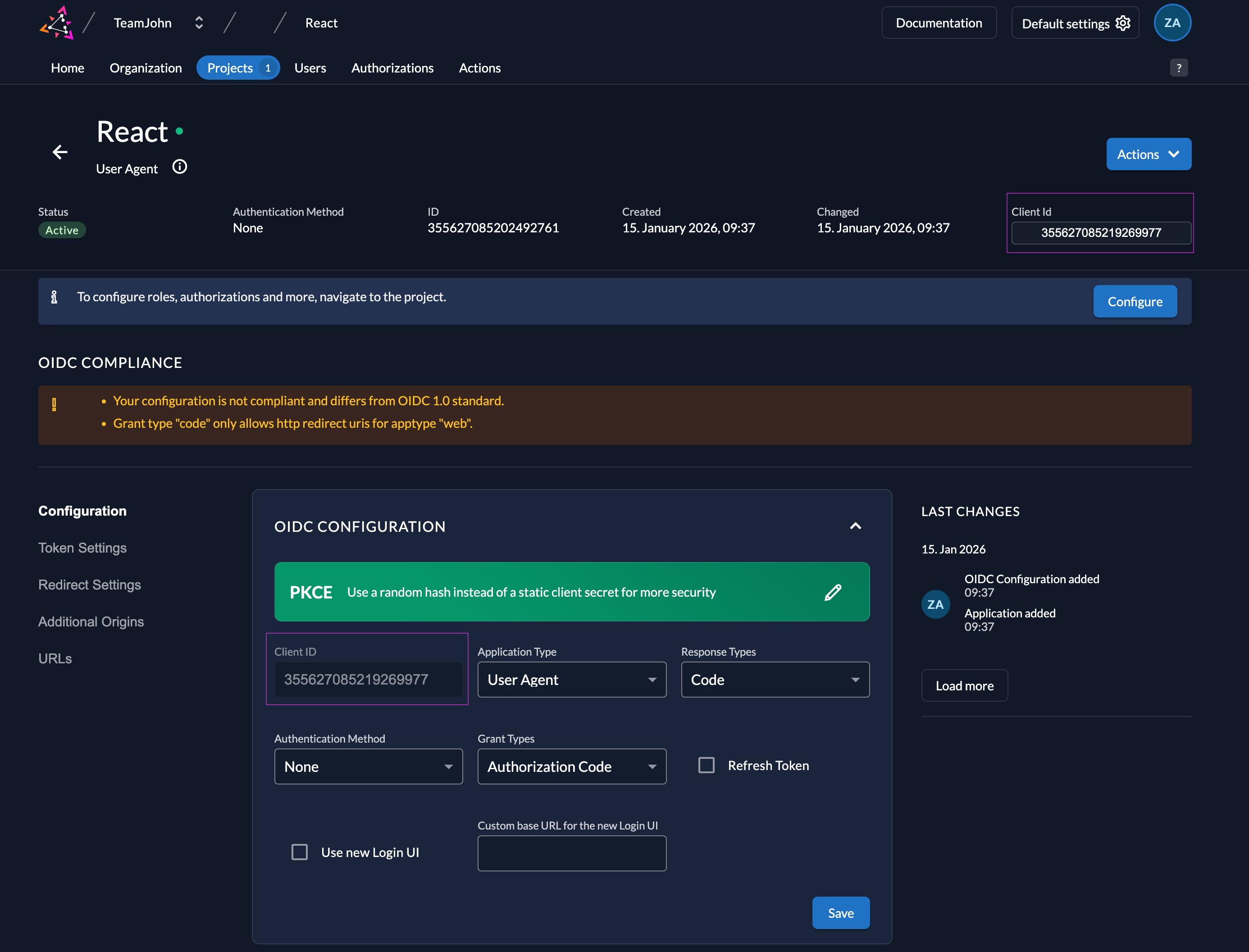 ZITADEL automatically configures the best security settings for your selected framework.